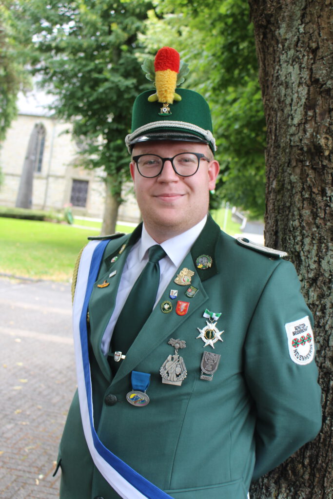 Tom ist seit 2020 Mitglied der Bruderschaft. Er arbeitet als Softwareentwickler bei dSPACE. Als Fahnenoffizier im Oberdorf und engagiertes Vorstandsmitglied ist er vielen bestens bekannt. Zu seinen Adjutanten ernannte er Jungschützenmeister Robin Meyer und Tobias Hake – und gemeinsam wurde der Treffer anschließend gebührend gefeiert. Der Moment, in dem der Vogel fiel, war für Tom und alle Mitfiebernden ein toller Moment. Seine Erwartungen an das kommende Jahr bringt er selbst auf den Punkt: „Viel gute Laune, eine gute Zeit – und Durst!“ Klingt nach besten Voraussetzungen für ein gelungenes Schützenfest.