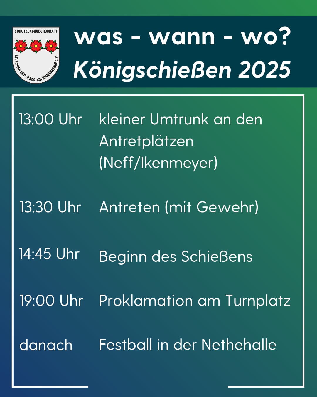 Um 13.30 Uhr treten die Schützen dann in Uniform mit Gewehr kompanieweise (Ikenmeyer/Neff) an. Die gewohnten Anlaufpunkte vor dem Königsschießen sind in diesem Jahr nicht besetzt. Ein paar Getränke stehen vor dem Antreten an den jeweiligen Antreteplätzen der Kompanien bereit. Nach dem Einholen des Königsadlers und der Bruderschaftsfahnen aus der Pfarrkirche wird unser Königspaar zu Hause abgeholt. Ab ca. 14.30 Uhr beginnt dann hinter der Nethehalle das Ringen um die Prinzen- und Königswürde. Gegen 19.00 Uhr ist die Königsproklamation am Turnplatz der Grundschule St. Walburga geplant. Im Anschluss daran wird direkt mit den neuen Majestäten, Hofstaat und allen neuen Würdenträgern zum Festball in die Nethehalle einmarschiert.
