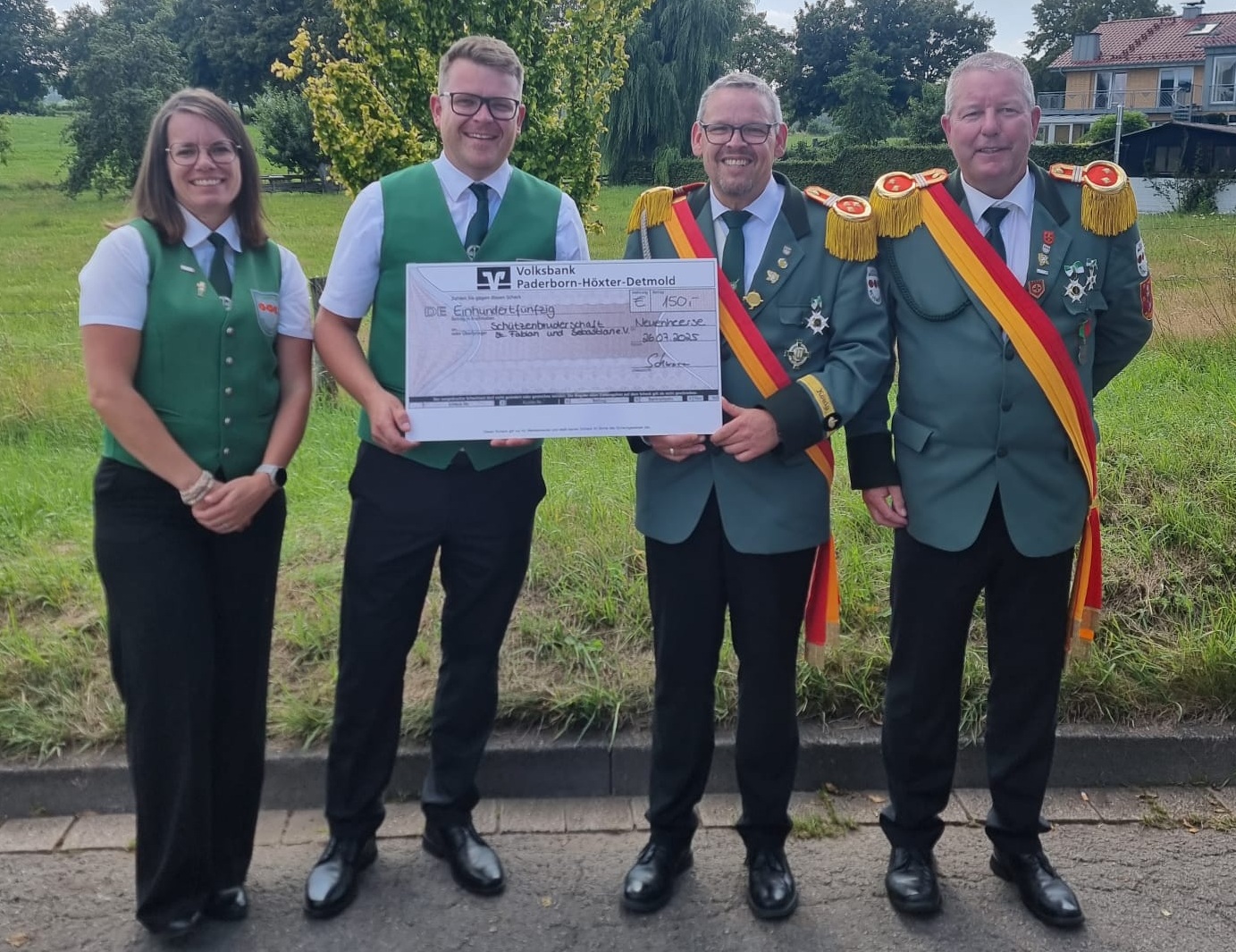 Eine schöne Geste mit großer Wirkung: Beim Königsschießen wurde der Schützenbruderschaft Neuenheerse offiziell eine Spende in Höhe von 150 Euro überreicht – übergeben vom Spielmannszug Neuenheerse, der das Geld durch seinen Weihnachtsbaumverkauf in Zusammenarbeit mit Agrar Transport Schwarze gesammelt hatte.