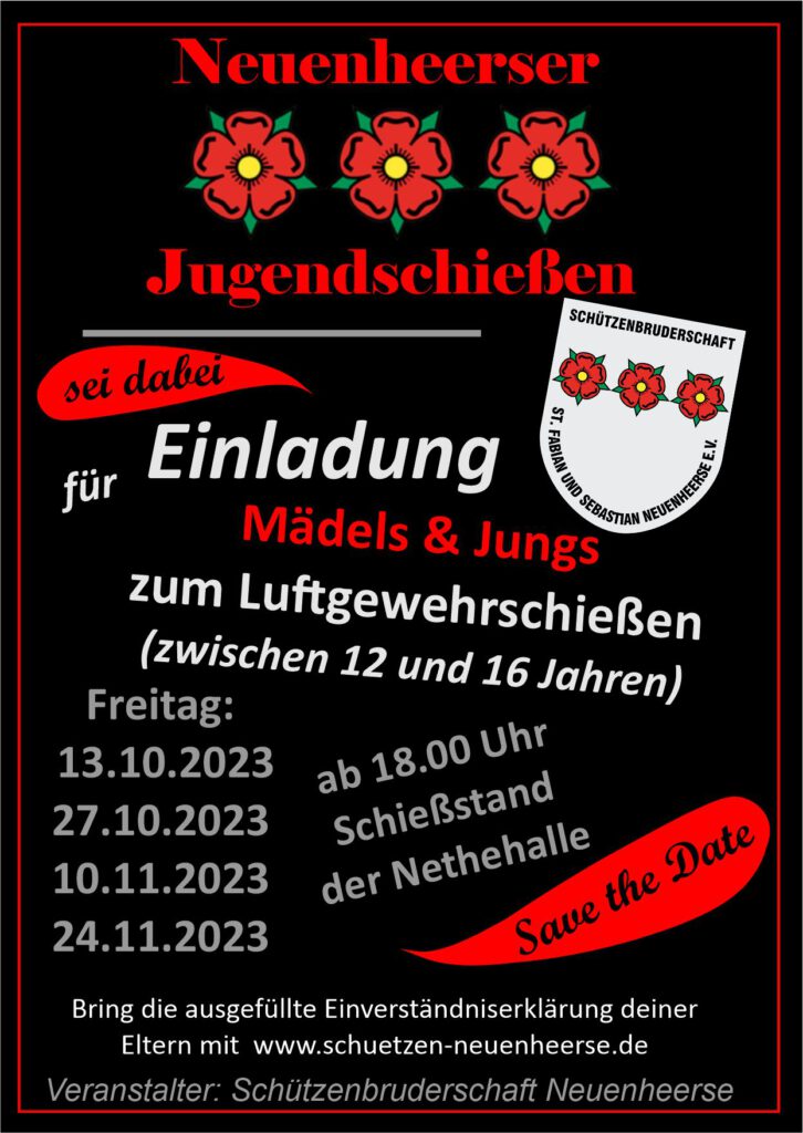Wer Schülerprinz werden will, muss am Jugendschießen teilnehmen – einer tollen Aktion, die von der Schützenbruderschaft regelmäßig für die Altersklasse 10-16 Jahren organisiert wird. Hier geht es nicht nur ums Gewinnen, sondern um Gemeinschaft, Konzentration, Fairness und Freude am Schießsport.