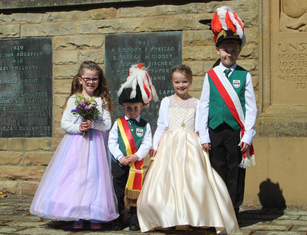 Das Bambini Königspaar, Antonia Marley und Nikolas Vogt, mit ihrem Hofstaat Marie Röhrig und Max Marlon Meyer, sowie Emilia Smith und Maxim Schuchart. Das Nethe Königspaar Lea Wiegard & Xaver Koolmann mit ihrem Hofstaat Marla und Leonor Clarke sowie Josephin Koolmann und Philipp Schwarz. Unsere diesjährige Kinderfahnenträgerin Isabella Klostermann wird von Marc Langner und Lasse Michels begleitet. Alle sind herzlich eingeladen am Sonntag, 11. August 2024 um 15.15 Uhr an der Ehrenmalfeier teilzunehmen, um anschließend auf dem Festplatz noch einige schöne Stunden mit ihnen zu verbringen.