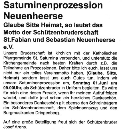 Der Vorstand der Schützenbruderschaft bittet um eine zahlreiche Teilnahme der Mitglieder in Uniform.