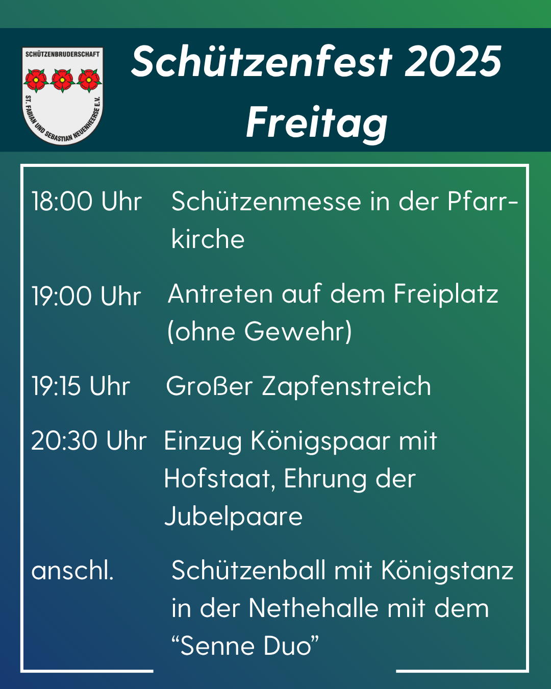 Liebe Schützen, liebe Neuenheerser/innen, sehr geehrte Gäste und Freunde der Schützenbruderschaft St. Fabian und Sebastian,