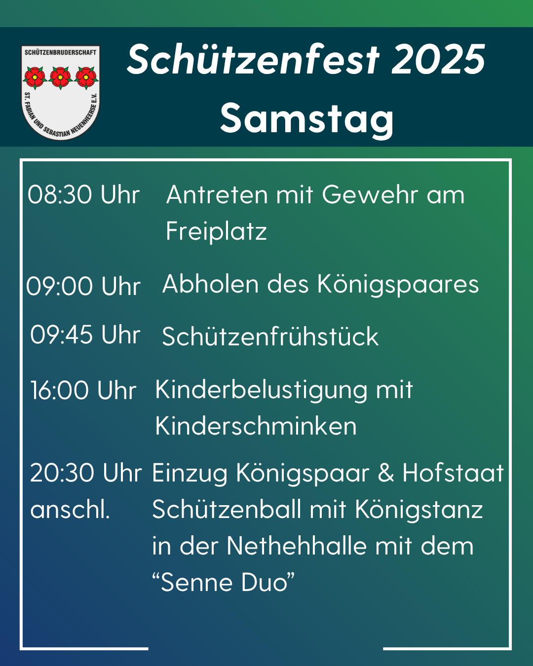 Die Neuenheerser Bevölkerung wird gebeten ihre Häuser zu beflaggen. Wer noch eine Neuenheerser Ortsfahne benötigt, möge sich bitte an den Vorstand der Bruderschaft wenden. Der Vorstand freut sich zusammen mit dem Königspaar Miriam und Sascha Klostermann, dem Hofstaat, dem Prinzenpaar Dustin Brosig und Jenni Mannott, der Schülerprinzessin Carina Macho, den Kindermajestäten und den Würdenträgern auf ein großartiges Schützenfest, zu dem alle herzlich eingeladen sind. Gefeiert wird in Neuenheerse von Freitag, den 09. August, bis Sonntag, den 11. August 2024. Neben vielen Highlights, sei besonders auf die Ehrungen der Jubelkönigspaare am Schützenfestfreitag um ca. 19.45 Uhr direkt nach dem Einmarsch in die Nethehalle hingewiesen. Am Schützenfestsamstag in der Zeit von 19-21 Uhr findet in der Nethehalle eine große Los-Aktion statt. Zu jedem gekauften Getränk gibt es 1 Los gratis dazu. Zu gewinnen gibt es tolle Preise. Die Verlosung findet am Sonntag, 11. August 2024 um 21 Uhr in der Nethehalle statt. An allen Schützenfesttagen ist freier Eintritt.