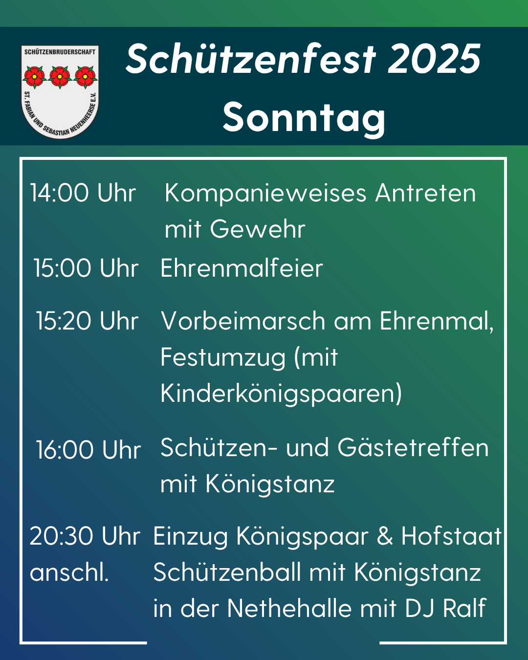 das Schützenfest in Neuenheerse ist seit jeher ein fester Bestandteil unseres dörflichen Lebens – ein Höhepunkt im Jahreslauf, der Menschen verbindet, Gemeinschaft erlebbar macht und unsere Heimat mit Leben erfüllt.