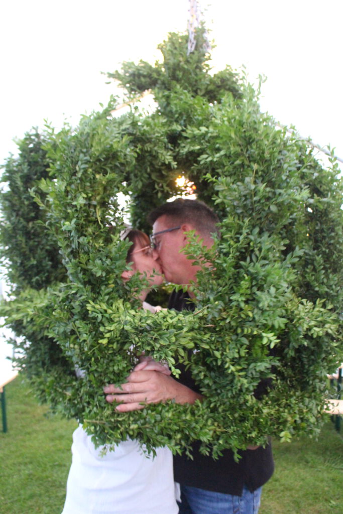 Ist die Krone vollendet, wird es musikalisch und feierlich: Das Lied „Wir waren zwei Königskinder“ erklingt aus vielen Kehlen – gesungen vom Vorstand, Gästen und dem gesamten Hofstaat. Natürlich darf das legendäre Kussfoto des Königspaares unter der frisch gewickelten Krone nicht fehlen – ein Schnappschuss für die Ewigkeit.